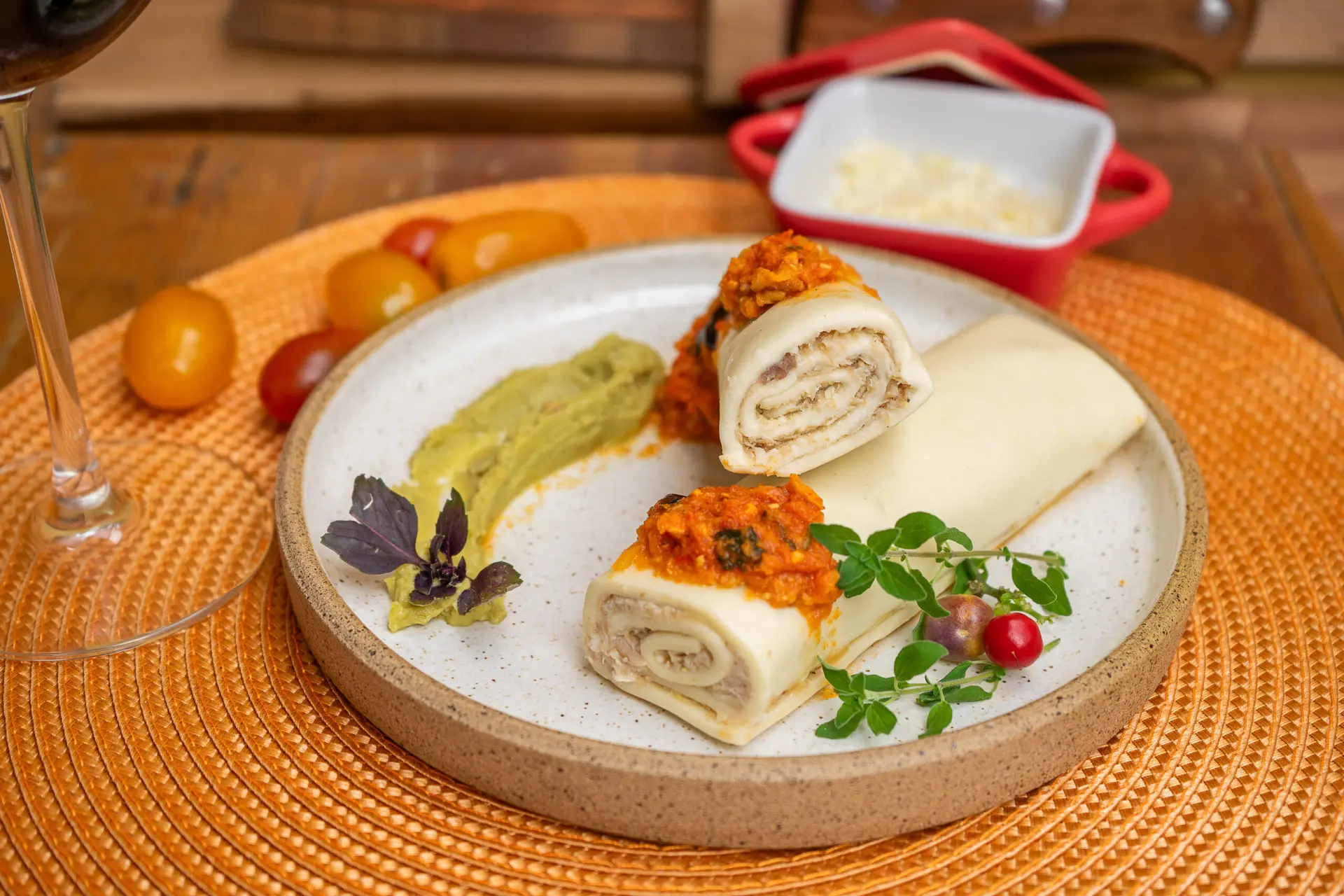 Frango desfiado com um toque de parmesão, em um canelone que é uma explosão de sabor.