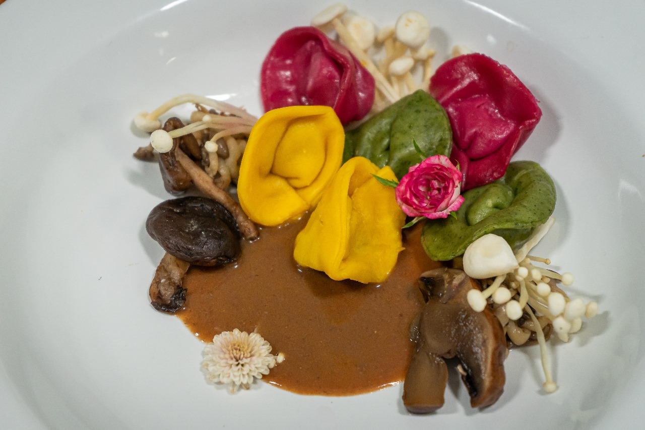 Capeletti nas cores vibrantes de abóbora, beterraba e espinafre, recheado com frango e parmesão, para um prato visualmente encantador e delicioso.
