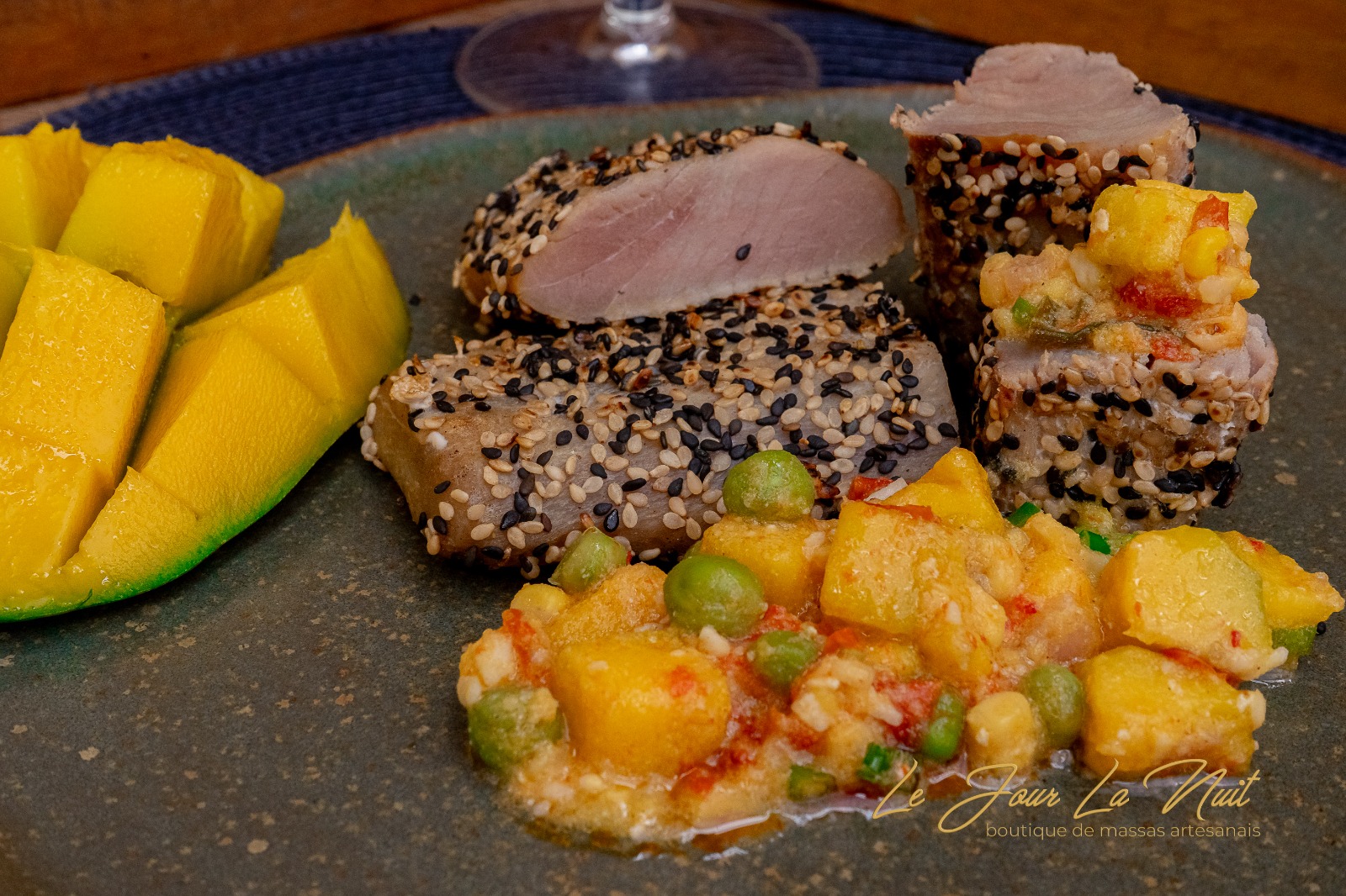 Atum fresco e suculento, harmonizado com um sucotash de milho e cogumelos, trazendo uma mistura de texturas crocantes e macias. O guisado de milho e tomate adicionam um sabor doce e leve, enquanto o molho de leite de coco com manga traz uma cremosidade tropical, com um toque exótico de gengibre e alho, que intensifica os sabores.