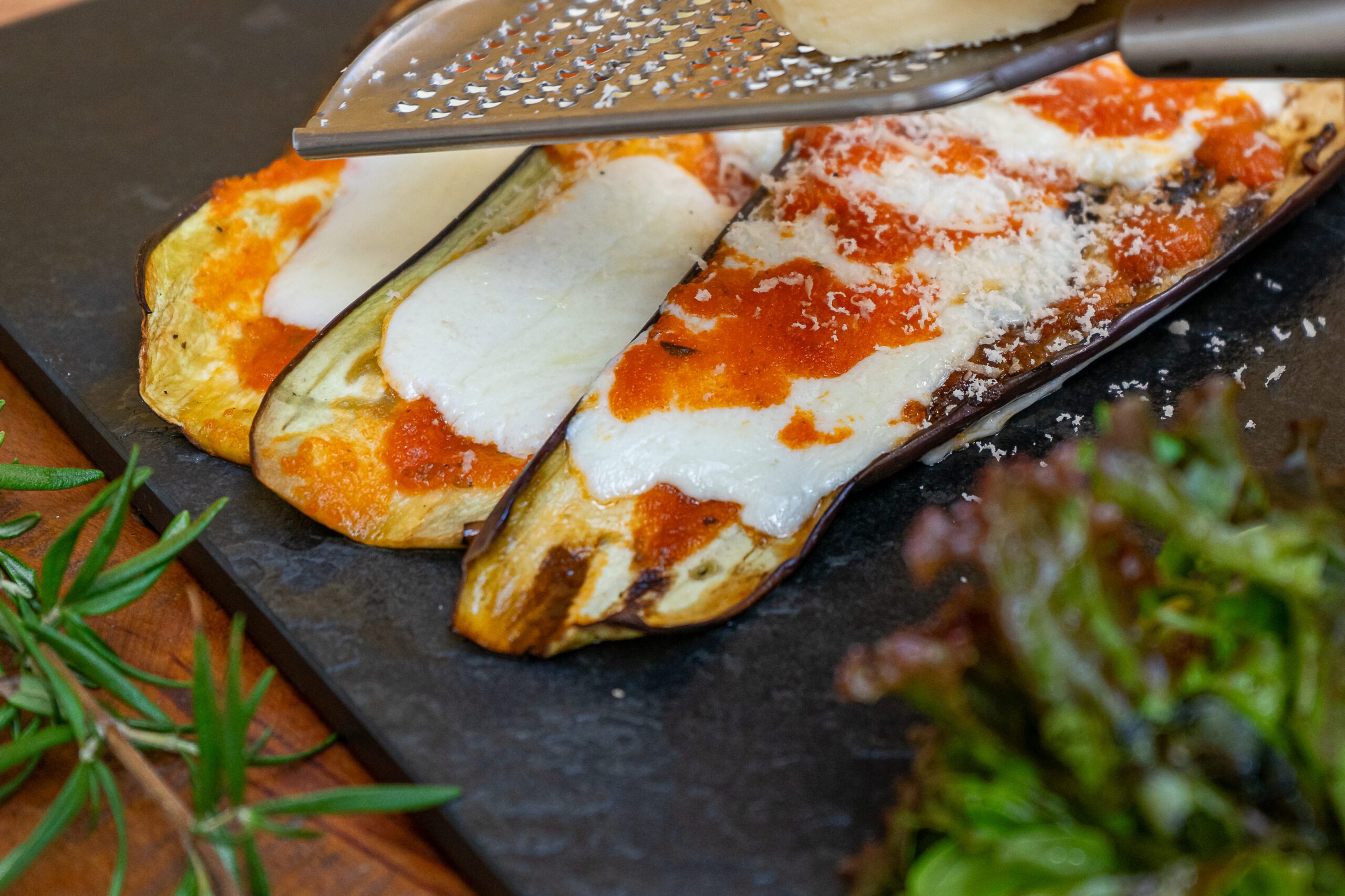 Berinjela ao Forno com Queijo Fontina, Molho Pomodoro e Pesto de Manjericão é uma combinação deliciosa e rica em sabores. A berinjela assada até ficar macia é coberta com queijo fontina, que derrete de forma cremosa e suave. O molho pomodoro, feito com tomates frescos e temperos, adiciona um toque de acidez e profundidade, enquanto o pesto de manjericão finaliza o prato com uma explosão de frescor e aroma.