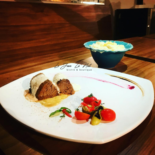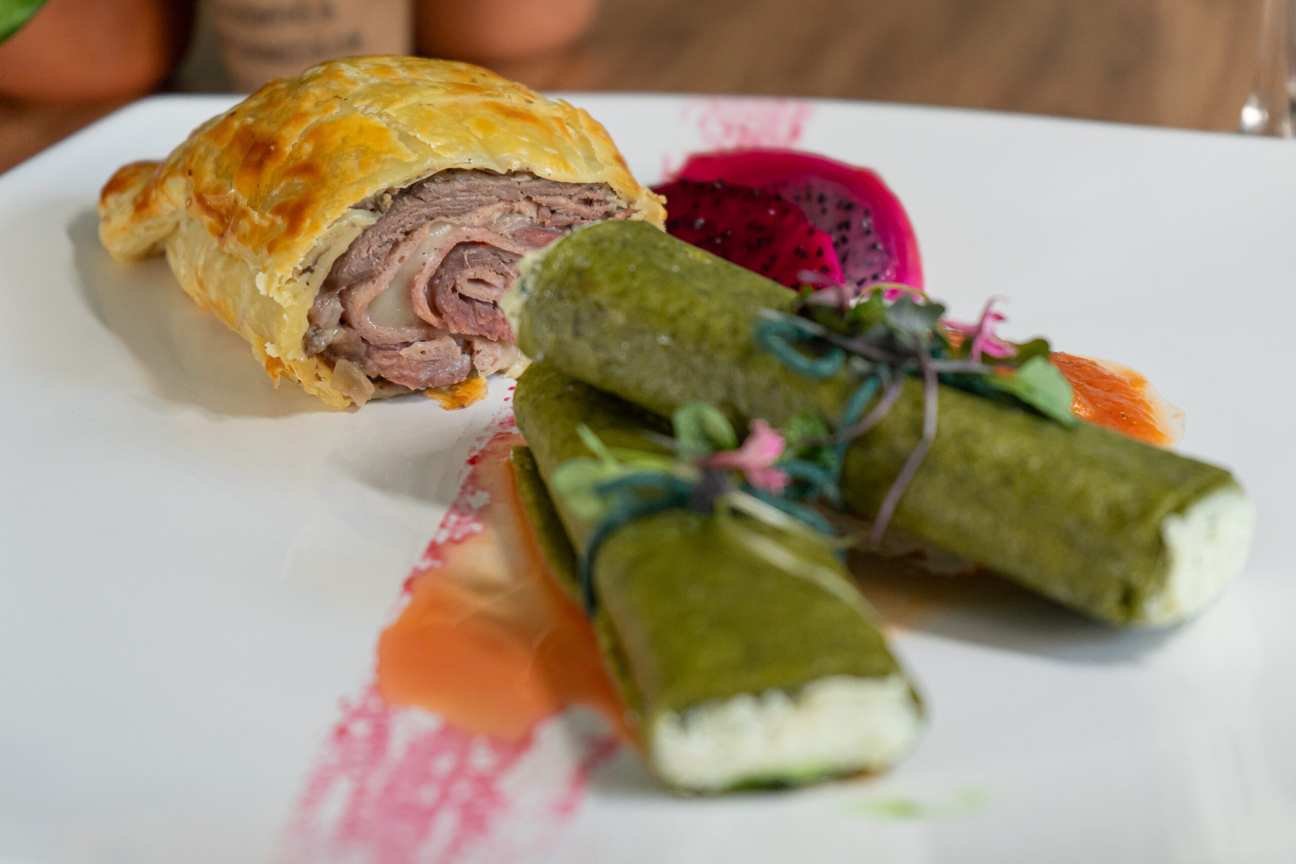 File mignon macio, crocante cordon bleu com queijo e presunto, canelone verde recheado com queijo meia cura e castanhas crocantes.