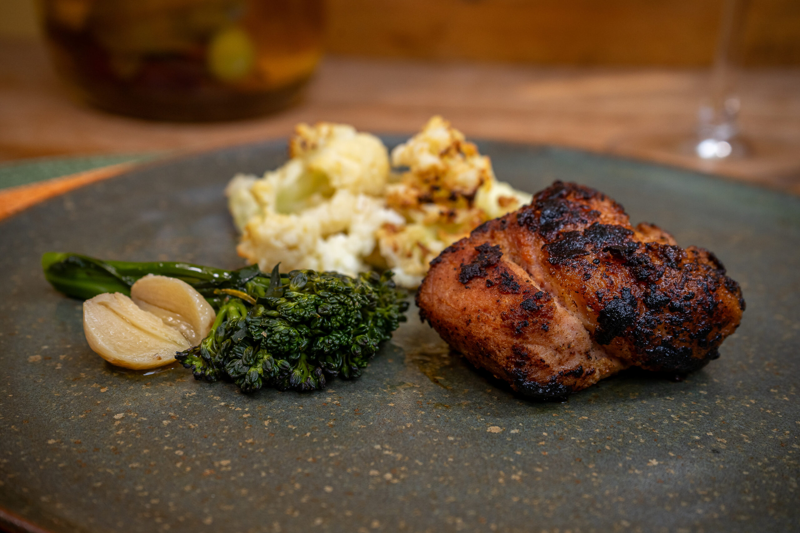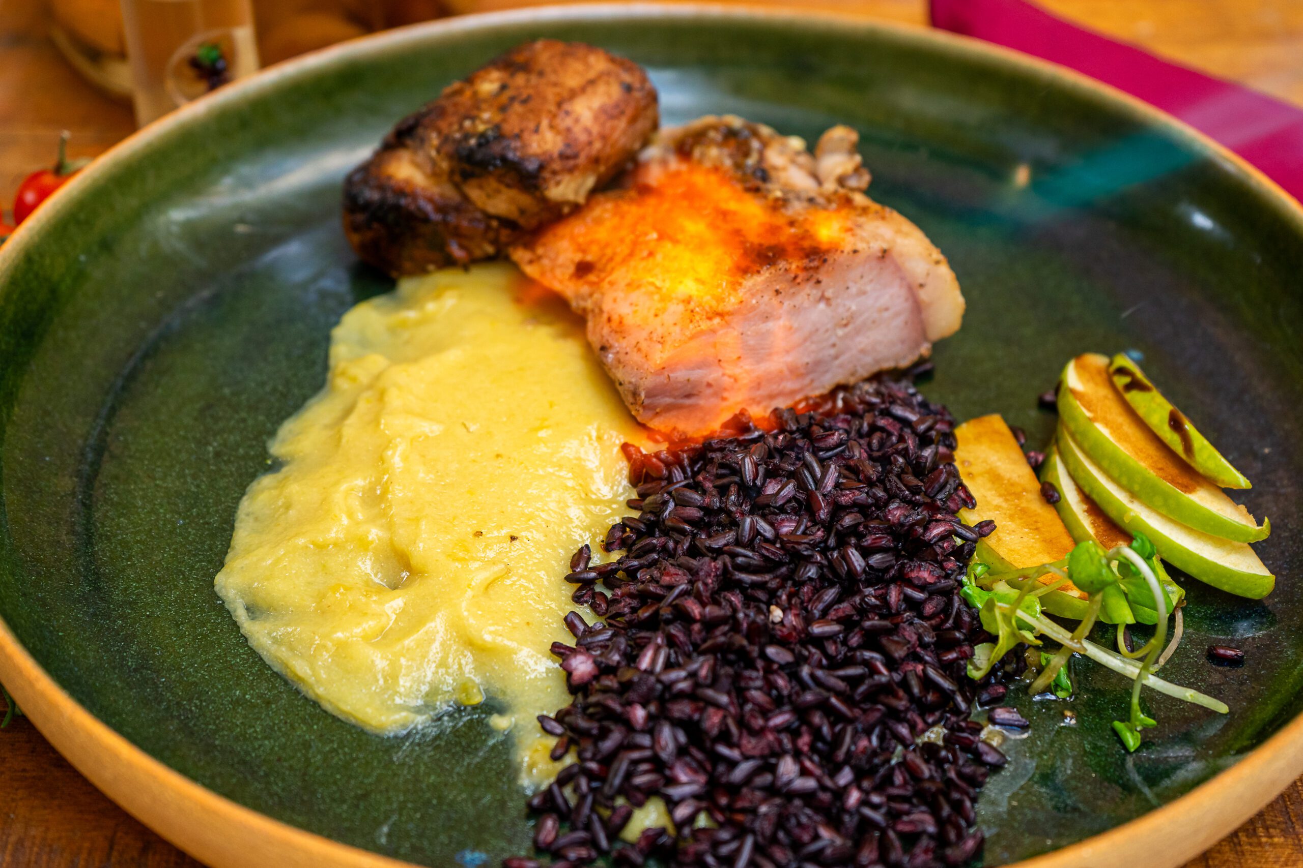 Filé mignon cozido sous vide e defumado, servido com legumes no vapor e arroz basmati com castanhas e caju. Um prato sofisticado, com carne macia e sabor defumado, acompanhado de legumes frescos e arroz aromático com crocância.